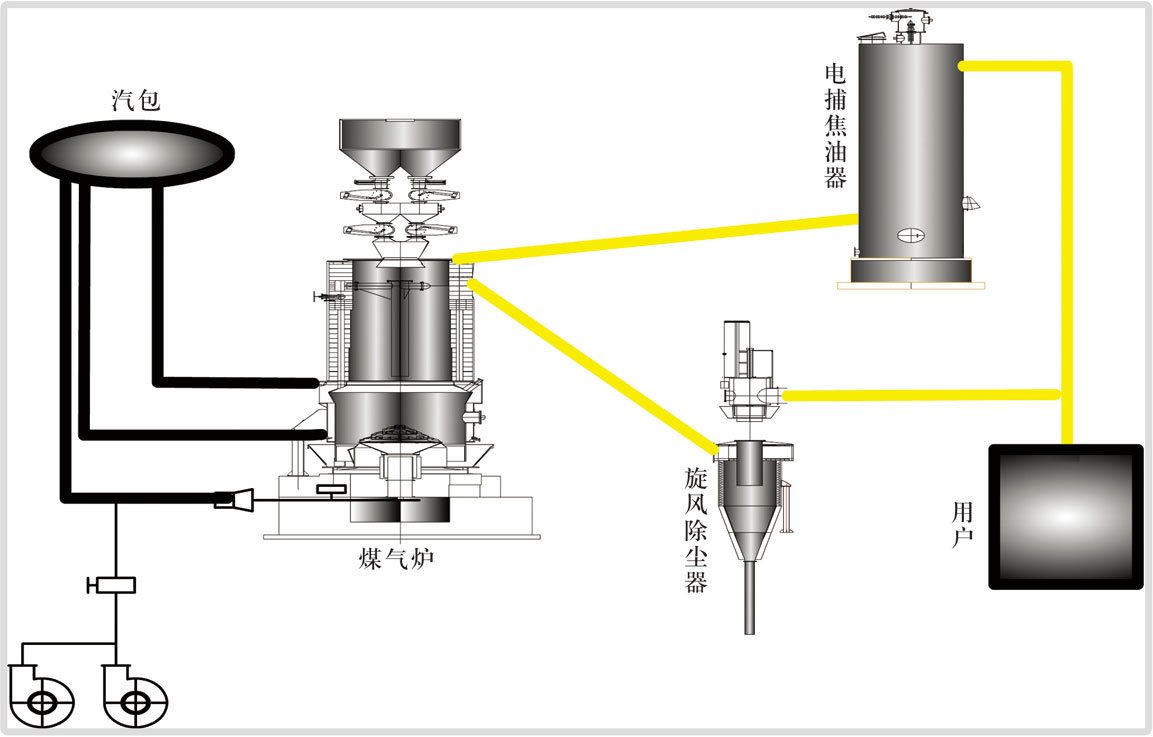 煤氣發(fā)生爐是將煤炭轉化為可燃性氣體——煤氣(主要成分為CO、H2、CH4等)的生產(chǎn)設備。工作原理為:將符合氣化工藝指標的煤炭篩選后,由加煤機加入到煤氣爐內,從爐底鼓入自產(chǎn)蒸汽與空氣混合物做為氣化劑。煤炭在爐內經(jīng)物理、化學反應,生成可燃性氣體,上段煤氣經(jīng)過旋風除油器、電捕器過濾焦油.下段煤氣經(jīng)過旋風除塵器清除灰塵,經(jīng)過混合后輸送到用戶使用。